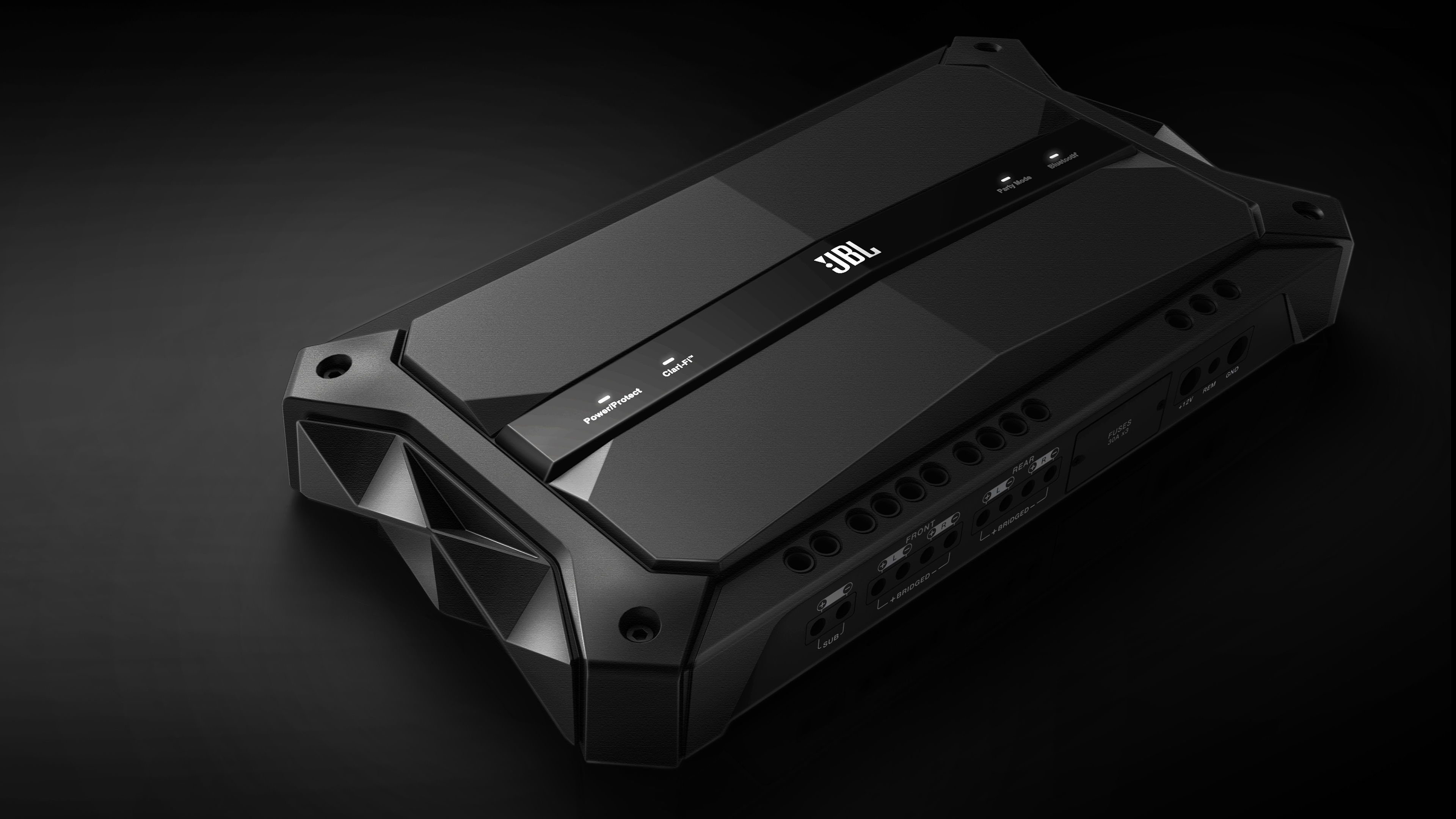The design language was developed to say modern, powerful, technological and innovative, all qualities that describe the JBL brand. Because we wanted to make a statement with the design, we avoided the typical "fins" that are usually used to dissipate heat; instead, we developed a folded, angular surface design that increased the surface area to meet all the cooling requirements while creating a unique and powerful visual signature for the line.