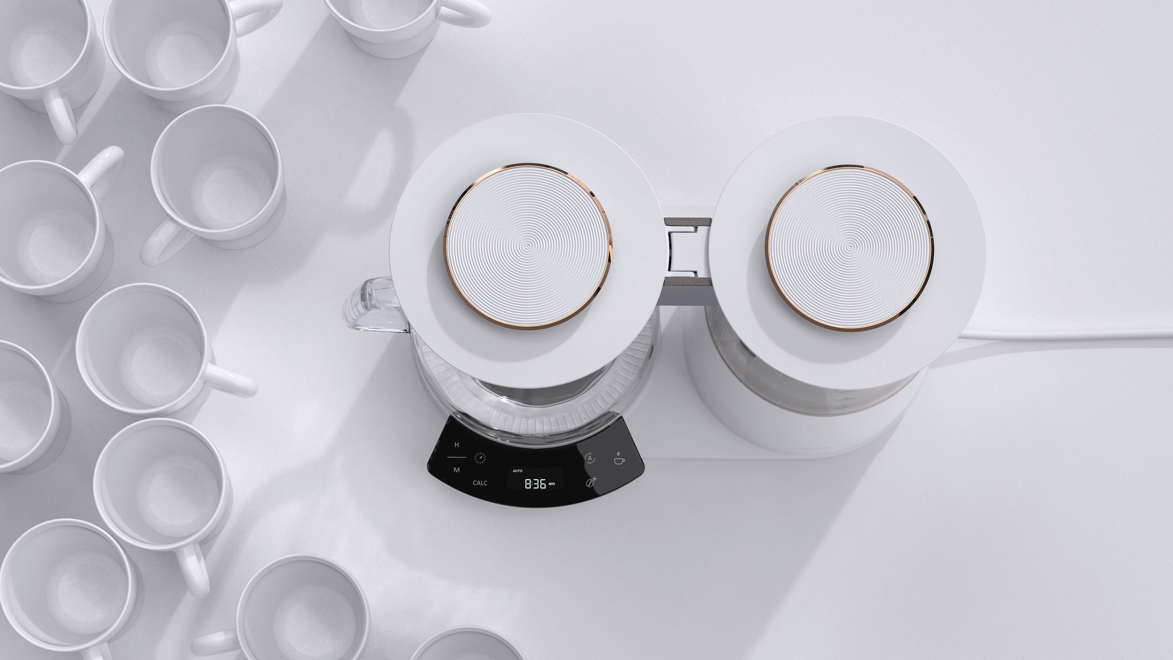 The two columns create a visual balance, with separate details providing equal visual weight. This coffee maker also uses dual independent water heaters to provide more precise control of water temperatures, an expensive feature important in making high quality coffee. To feature this water heating process, we made the water tube visible and added an led light, so as the water starts to boil and travel thru the water tube riser, it is illuminated and featured for visual enjoyment.